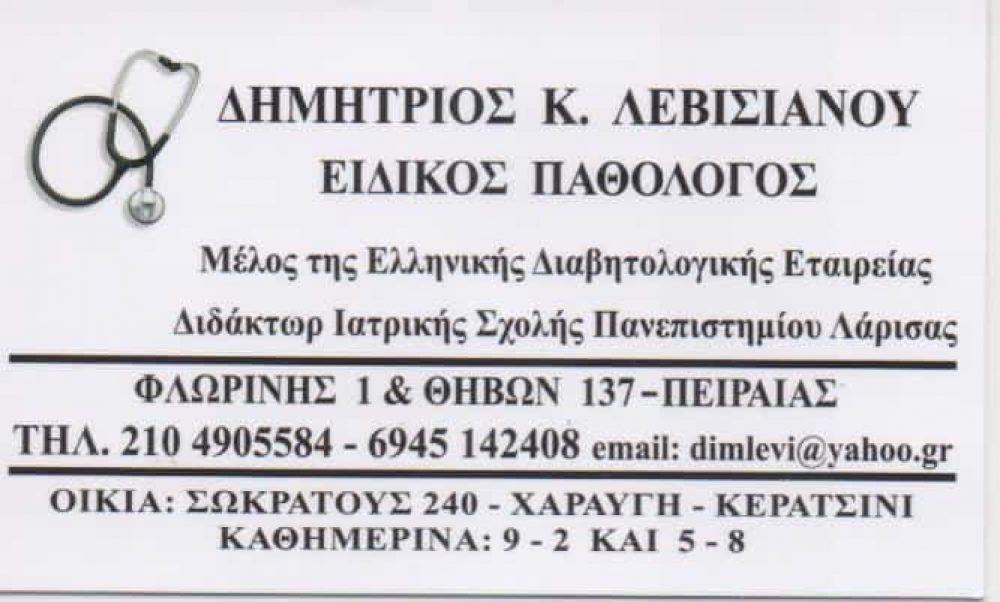 ΠΑΘΟΛΟΓΟΣ ΣΤΟΝ ΠΕΙΡΑΙΑ, ΠΑΘΟΛΟΓΙΚΟ ΙΑΤΡΕΙΟ ΠΕΙΡΑΙΑΣ, ΕΙΔΙΚΟΣ ΠΑΘΟΛΟΓΟΣ ΠΕΙΡΑΙΑΣ, ΛΕΒΙΣΙΑΝΟΥ ΔΗΜΗΤΡΙΟΣ ΠΑΘΟΛΟΓΟΣ, ΠΕΙΡΑΙΑΣ,ΔΙΑΒΗΤΗΣ ΠΕΙΡΑΙΑΣ,ΥΠΕΡΤΑΣΗ ΠΕΙΡΑΙΑΣ,ΛΙΠΙΔΙΑ ΠΕΙΡΑΙΑΣ,ΙΑΤΡΟΣ ΠΕΙΡΑΙΑΣ,ΥΓΕΙΑ ΠΕΙΡΑΙΑΣ