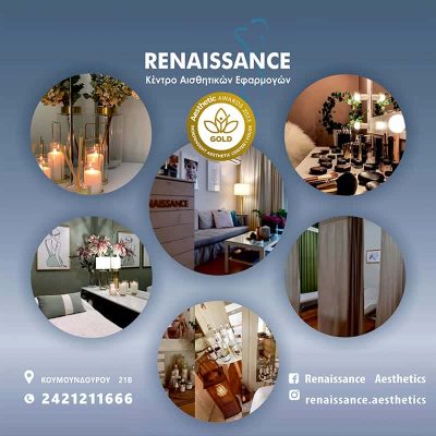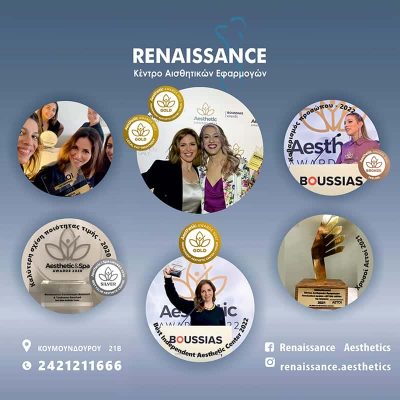 BEST INDEPENDENT AESTHETIC CENTER Rest of Greece/Volos – 2022 Το κέντρο αισθητικής Renaissance Aesthetics διακρίθηκε με το πανελλήνιο Χρυσό Βραβείο στην κατηγορία: Independent Aesthetic Center – Rest of Greece/Volos για το 2022. Επιπλέον, απέσπασε ξεχωριστή διάκριση για την υπηρεσία ΒΑΘΥΣ ΔΕΡΜΑΤΟΛΟΓΙΚΟΣ ΚΑΘΑΡΙΣΜΟΣ ΠΡΟΣΩΠΟΥ: Πανελλήνιο Χάλκινο βραβείο στην κατηγορία: Βαθύς καθαρισμός προσώπου – Peeling.